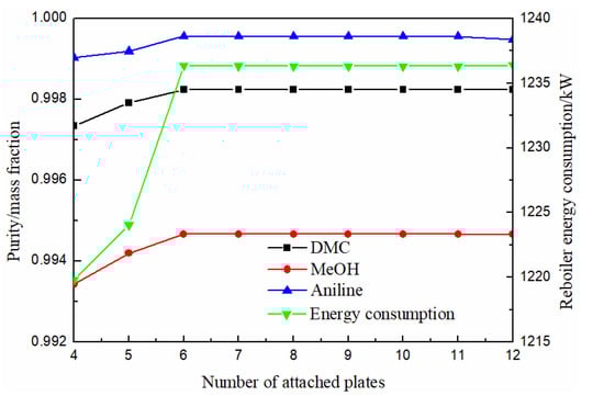 Effect of numbers of attached plate on products purity and heat duty of reboiler.