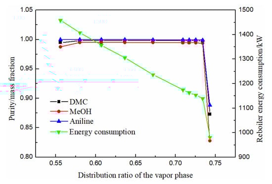 As can be seen from Figure 9, the purity of methanol, DMC and solvent aniline all increased at first, then slowly stabilized, and finally decreased rapidly with the increase of the gas phase distribution ratio. When the gas phase distribution ratio was between 0.58 and 0.67, the purity of DMC reached above 0.998. The energy consumption decreased rapidly with the increase in the gas phase distribution ratio. Therefore, the optimal gas phase distribution ratio was 0.67.
