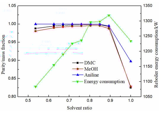 The influence of solvent ratio on product separation effect and energy consumption of reboiler is shown in Figure 10. Methanol, DMC and solvent aniline all increased first with the increase of solvent ratio. When the solvent ratio was 0.76, DMC purity reached the maximum of 0.9982 and then began to decrease. The energy consumption increased gradually and then decreased with the increase in solvent ratio. Therefore, the optimal solvent ratio was 0.76.