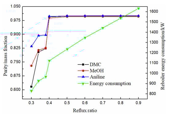 The reflux ratio is an important parameter in the process of a distillation column. Generally, the higher the reflux ratio is, the better the separation effect will be. However, the higher the energy consumption will be, so a reasonable reflux ratio should be selected. As can be seen from Figure 11, the purity of methanol, DMC and solvent aniline all increased with the increase of reflux ratio, and almost remained unchanged when the reflux ratio was greater than 0.5, while the energy consumption of the reboiler at the bottom of the column gradually increased with the increase of reflux ratio. Therefore, the optimal reflux ratio was 0.5.