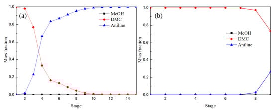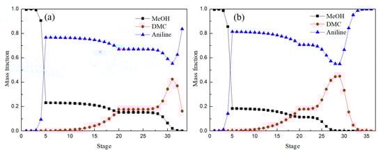 It is worth noting, as shown in Figure 14a, that the DMC mass fraction in CEP with the stage down first increased, and at the bottom of the 31st feed position reached the highest position, and then reduced rapidly, resulting in the DMC at a relatively low concentration to further separation. The results indicated that in CEP existed back-mixing. While the mass fraction of DMC reached the maximum at the bottom of the extraction section (III) of the main column and then entered the side-line distillation section (IV) and solvent recovery section (V) to further separate product DMC and solvent aniline, effectively avoiding back-mixing and improving the separation efficiency. Therefore, the EDWC is more energy efficient than the CEP.