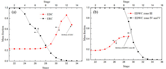 Figure 13 shows the composition distribution of the liquid phase in ERC and the attached column of EDWC. By comparing Figure 13a,b, it was found that the liquid phase distribution of 1–3 theoretical stages in the ERC was consistent with that in the attached column of EDWC. The composition of the liquid phase distribution of 4–15 theoretical stages in ERC was similar to that of solvent recovery section V (30–36 theoretical stages) of EDWC as shown in Figure 12b, which fully indicates that EDWC has achieved the coupling of extraction and recovery. Zones IV and V in the EDWC are equivalent to the extractant recovery column in the CEP.