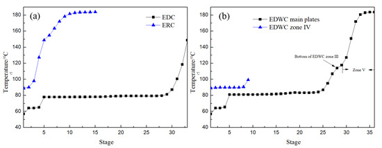 Figure 15a,b is the temperature distribution of CEP and EDWC, respectively. The temperature distribution trend of the EDC in the CEP was basically consistent with that of the main column I, II and III of the EDWC, indicating that zones I, II and III in the EDWC are equivalent to the EDC in the CEP. The other temperature distribution trend of the ERC was similar to the combined temperature distribution trend of the side-line distillation section (IV) and solvent recovery period (V), further proving that sections IV and V are equivalent to the ERC in the CEP.