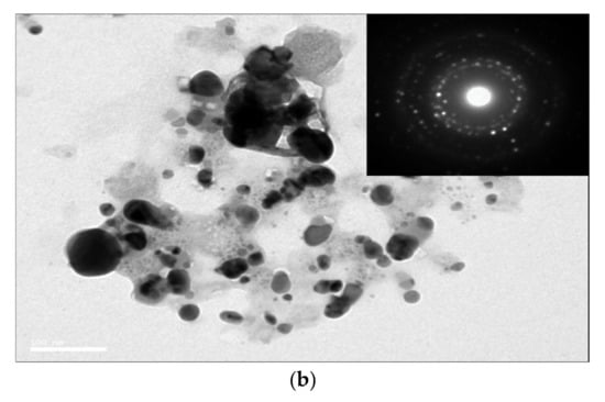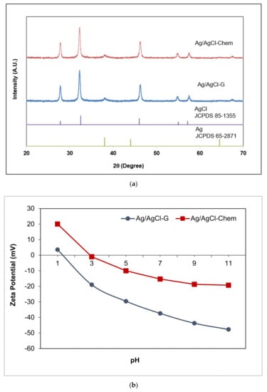 To compare surface properties, zeta potentials were determined for Ag-chem, Ag-G, Ag/AgCl-chem, and Ag/AgCl-G at pH 7 and 25 °C. They were found to be −7.65, −30.13, −15.3, and −35.37 mV, respectively, showing a negative charge distribution on the surface of Ag nanoparticles. Interestingly, nanoparticles synthesized using green chemistry had higher negative charges than those synthesized using classical chemical methods. The zeta potential of Ag/AgCl-G (Figure 1b) also revealed that the negative charge on the surface increased with increasing pH. The surface was fully covered with a negative surface charge at high pH, enhancing adsorption of cationic ions such as MC onto its surface. This zeta potential of Ag-G was consistent with that found in previous work [] and for other Ag and Au nanoparticles stabilized with sugars such as citrate [,], maltose [], gum acacia (a polysaccharide) [], glucose [], and galactose [].