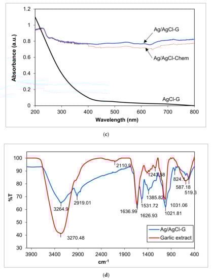The XRD patterns of Ag/AgCl-G nanoparticles (a); zeta potential of Ag/AgCl-G (b); absorption spectra of Ag/AgCl-G, Ag/AgCl-Chem, and AgCl-G nanoparticles (c); and FTIR spectra of Ag/AgCl-G and garlic extract (d).