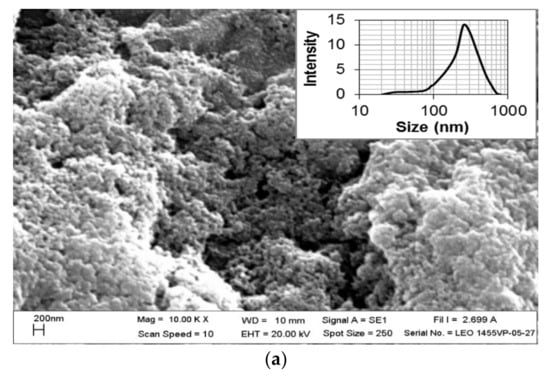 The selected-area electron diffraction (SAED) pattern of Ag/AgCl-G demonstrates the randomly oriented diffraction spots, representing that these synthesized nanoparticles are polycrystallinity in nature. The SEM image exhibits aggregation among the obtain nanoparticles. The agglomerate particle size of Ag/AgCl-G was about 250.8 ± 24.1 nm as shown in Figure 2a (inset). The agglomeration formation of the investigated nanoparticles is possibly occurred from the high ionic content of Na, Cl, and NO3 from the electrolyte concentration as discussed in the previous work [].