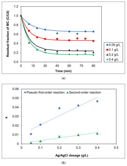 The effect of Ag/AgCl-G dosages on MC removal was investigated, and the results are shown in Figure 3a. Increasing the dosage of Ag/AgCl-G from 0.05 to 0.4 g L−1 led to a pronounced increase in photocatalytic degradation of MC (from 34.07% to 77.52%). A further increase (to 0.4 g L−1) afforded a slight increase in photocatalytic efficiency in MC discolorization, but identical activities were observed after 90 min exposure to visible light. This phenomenon may be explained by the difficulty of permeating light through the solution when the catalyst was at higher concentrations. Alternatively, as reported previously, an increase in the catalyst can decrease photoabsorption, reducing the pollutant adsorption onto the catalyst surface, thus reducing reaction rates [,].