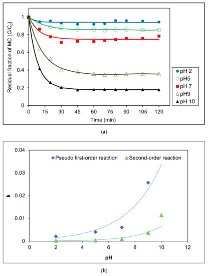 The effect of pH on the degradation of MC by a photocatalytic process under visible light was analyzed in the range of pH 2–pH 10 using 0.4 g L−1 Ag/AgCl-G. Figure 4a shows that degradation was highly effective at higher pH values especially at pH 10. Photocatalytic degradation kinetics of MC in various pH solutions were measured using the change in MC concentration as shown in Figure 4b. Kinetic parameters at various pH are reported in Table 2. Based on correlation coefficients, photocatalytic reactions were well-described by pseudo-first order model. Reaction rate enhancement at pH 10 was much higher than that at pH 2, likely attributable to the high adsorption of MC on the surface of Ag/AgCl-G resulting from the negative zeta potential of the photocatalyst in alkaline pH. The reaction rate at pH 10 (r = 0.5829 mg L−1 min−1) was elevenfold that at pH 2 (r = 0.0530 mg L−1 min−1). The rate constant of the photocatalytic reaction (explained by first-order model) at pH 2 was only 2.10 × 10−3 min−1, whereas pH 10 was up to 4.70 × 10−2 min−1. These increases clearly show the influence of the pH on the photocatalytic activity of Ag/AgCl-G.