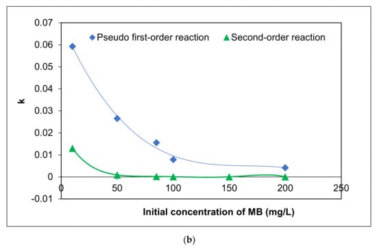 To investigate the kinetics of photocatalytic discolorization reactions between MC and Ag/AgCl-G, experimental results for the photodegradation of MC on the Ag/AgCl-G were applied to pseudo-first-order and second-order kinetic models using Equations (2) and (3):