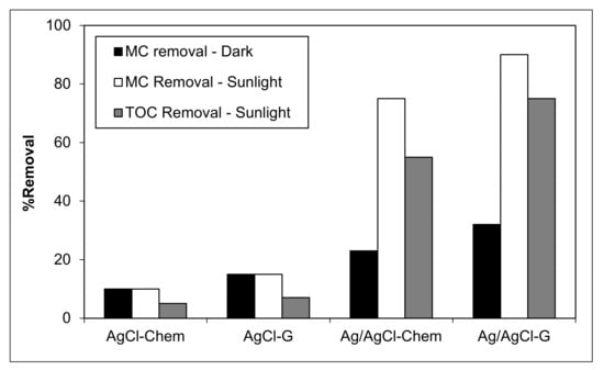 To demonstrate plasmonic photocatalytic activity in natural conditions, MC removal was investigated under sunlight using AgCl-chem, AgCl-G, Ag/AgCl-chem, and Ag/AgCl-G. Photocatalytic activity, represented by the percent decrease in MC concentration and the mineralization ability, represented by the percent decrease in total organic carbon (TOC), is shown in Figure 6. In all cases, pH was 10, catalyst dosage was 0.4 g L−1, initial MC concentration was 20 mg L−1, and the exposure time was 60 min. Prior to illumination, all mixtures were equilibrated in the dark for 30 min. The measured quantity of MC was inversely proportional to the color loss of the chemical during photocatalysis. Results show that both AgCl-chem and AgCl-G had minimal effect on removing MC (15–17% degradation) from an aqueous solution. During the dark experiment, the Ag/AgCl-G had the highest percentage (32.2%) of MC adsorption on its surface. The rising of both MC and TOC removal percentages occurred during natural sunlight irradiation. Both Ag/AgCl catalysts provided a high percentage of MC and TOC removal. Between them, Ag/AgCl-G had the higher activity, removing MC and TOC by 90% and 75%, respectively. Comparatively, Ag/AgCl-chem can remove only 75% and 55%, respectively. The order of reactivity for the removal of MC and TOC in the aqueous solution was as follows: Ag/AgCl-G > Ag/AgCl-chem > AgCl-G > AgCl-chem.