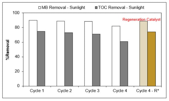 The long-term stability of the photocatalysts was determined over multiple cycles of MC by Ag/AgCl-G under sunlight. As shown in Figure 7, under the same experimental conditions, it was found that the degradation percentage MC and TOC slightly decreased after three cycles of photocatalytic. However, the MC and TOC removal efficiency of Ag/AgCl-G decreased significantly in the fourth cycle from 90% MC removal in the first cycle to 82% and from 75% TOC removal in the first cycle to 61%. These results expressed a significant long-term stability of the Ag/AgCl-G photocatalysts for the degradation of MC and TOC under the sunlight.