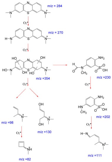 Performing GC/MS of residual MC after sunlight irradiation, a degradation pathway was proposed and is shown in Figure 8. The MC (m/z = 284) can be degraded into several intermediate products before mineralization. The spectrum obtained after 60 min reaction time revealed the presence of major intermediates N-methyl-N-(7-(methylamino)-3H-phenothiazin-3-ylidene) methanaminium (m/z = 270) at 20.1 min retention and N-(7-(hydroxyl(methyl)amino)-3H-phenothiazin-3-ylidene)-N-methylmethanaminium (m/z = 354) at 40.1 min retention, suggesting oxygen is incorporated into the structure of MC. The single bonds between N and CH3 and N and C are also broken. Peaks at lower masses identify 2-amino-5-(N-methylformamido) benzenesulfonic acid (m/z = 230) and 2-amino-5-(methylamino) benzenesulfonic acid (m/z = 202), suggesting that the photocatalytic oxidation process led to degradation into smaller molecular fragments (at m/z 82, 98, 111, and 130), which were further oxidized until finally transformed into CO2, H2O, HNO3, and H2SO4 [,,].