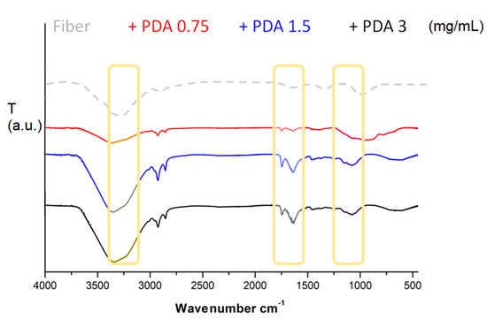 FT-ATR spectra (Figure 1) of bare and coated fibers contained Si-O stretching signal visible at 1150–1210 cm−1. Only coated fibers contained multiple and complex signals around 1435, 1625, and 1730 cm−1, corresponding to pyrrole intra-moiety, C=C quinone moiety, and C=O stretch, and related to polydopamine backbones. Moreover, signal of water around 3455 cm−1 exhibited a shoulder signal around 3260 cm−1, corresponding to internal amine-based moieties [31,32,33].