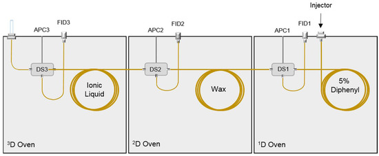 - Sciarrone, D.; Schepis, A.; De Grazia, G.; Rotondo, A.; Alibrando, F.; Cipriano, R.R.; Bizzo, H.; Deschamps, C.; Sidisky, L.M.; Mondello, L. Collection and identification of an unknown component from Eugenia uniflora essential oil exploiting a multidimensional preparative three-GC system employing apolar, mid-polar and ionic liquid stationary phases. Faraday Discuss. 2019, 218, 101–114. [Google Scholar] [CrossRef]