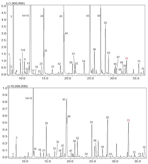 The composition of the EO and hydrosol volatile fractions of the M. communis L. leaves was investigated by GC-MS (Figure 2) and GC-FID analyses; 75 components were detected in both samples, accounting for 98.6% and 93.8% of the oil and extract, respectively. Peak identification was achieved by means of GC-MS exploiting the linear retention indices (LRIs) calculated against a C7–C30 alkane homologous series. Two filters were applied as criteria for positive identification in the library search, namely a minimum MS similarity of 85% and a tolerance window of ±5 LRI units with respect to the experimental LRI. Only one component, accounting for about 0.78% of the oil and 7.29% of the hydrosol extract, was not identified due to the lack of any spectral and LRI data in the MS libraries.