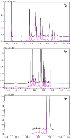 Prep-MDGC stand-by (black trace) and cut (pink trace) chromatograms of M. communis L. hydrosol extract relative to the first (1D), second (2D), and third dimension (3D).