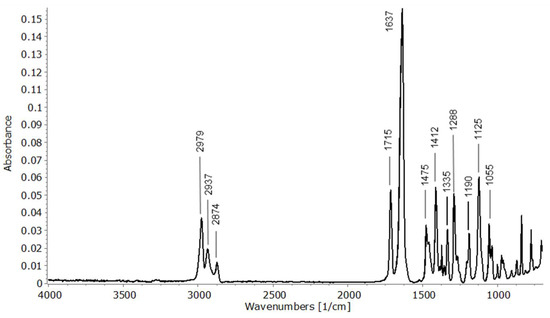Once pure milligrams of the target molecule were collected by means of the prep-MDGC approach and spectroscopic analyses were carried out for structure elucidation, consisting of solid phase GC-FTIR and NMR. Although not widespread, hyphenated GC-FTIR provides a very useful identification tool through the combination of highly efficient separation and highly specific fingerprinting of functional groups in unknown substances. Furthermore, the information provided by FTIR detection is complementary to those afforded by MS and may assist in the discrimination between isobaric compounds and regioisomers. Noticeably, GC-FTIR techniques based on the use of solid deposition interfaces provide superior resolution and lower detection limits compared to gas phase devices [32,33]. In this study, FTIR analyses were performed by direct micro deposition of the column eluent after a GC separation on a cryogenically cooled ZnSe sample disc. Solid phase IR spectra of the eluted compounds were recorded in real-time from 10 μm × 10 μm spots in the 4000–700 cm−1 range, with a resolution of 4 cm−1. Disc rotation speed plays a fundamental role in determining the overall performance of the GC-FTIR technique since it should allow for sufficient data points to be taken across the GC peak, to obtain a good quality IR spectrum [34]. Hereby, a disc speed of 3 mm min−1 provided the best results in terms of detection sensitivity whilst preserving the chromatographic resolution. A second parameter affecting the sensitivity of solid phase GC-FTIR is the amount of chilling provided to the ZnSe disc, which related to the volatility degree of the analytes to be deposited. In these experiments, the maximum analyte recovery in the solid state was obtained at a disc temperature of −50 °C. The reconstructed FTIR spectrum of the target compound obtained in the mid-IR is shown in Figure 5. In the high wavenumber region, absorptions due to C–H stretching were detected from 3000–2840 cm−1, while the stretching vibrations of the C=C bonds gave rise to a band centered at 1637 cm−1. Finally, a carbonyl stretching vibration band C=O showed up as a strong signal at 1715 cm−1, typical of the saturated ketones.