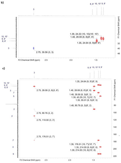 NMR spectra of the target molecule were acquired, exploiting both 1D and 2D NMR techniques to detect proton and 13C resonances. Figure 6 show the monodimensional 1H and two 1H-13H hetero-correlated experiments, namely HSQC and HMBC. The first two experiments define the unambiguous chemical shift (δ) assignment of the proton resonances and the relative 13C parent resonances. The last HMBC spectrum, connecting 1H and 13C resonances through two or three bonds (2J and 3J), is shown in Figure 6c and allowed the assignment of the quaternary 13C resonances opening the way to the definite structural elucidation.