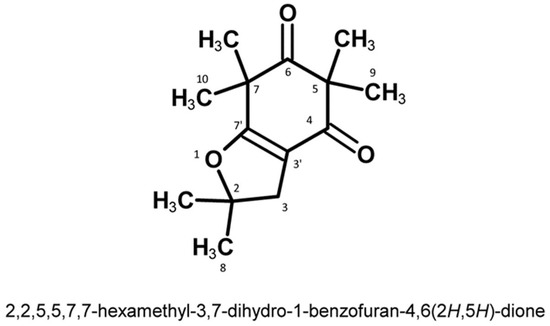 In detail, the protonic spectrum showed only four signals, with relative integrations 2:6:6:6. The related HSQC edited experiment highlighted the presence of six methyl groups distributed in three equivalent couples and one methylene group. Taking advantage of 2D HMBC hetero-correlated spectroscopy, it was possible to detect seven quaternary carbon atoms. Among the latter 13C signals, three were over 170 ppm. Considering that oxygen represented the only other atom type in the molecule, it was arguable that the three high-frequency 13C were each connected to three different oxygen atoms. Such an observation was consistent with the chemical formula C14H20O3 and the molecular weight of 236 amu, obtained from the corresponding MS spectrum. The definite structure elucidation came from direct (COSY and HSQC) and long-range (TOCSY and HMBC) connections, eliciting the structure in Figure 7, corresponding to 2,2,5,5,7,7-hexamethyl-3,7-dihydro-1-benzofuran-4,6(2H,5H)-dione. Finally, an experimental LRI value of 1518 was calculated for the isolated compound on an SLB-5ms column against an ALKs C7-C30 homologous series. All the data collected were used to register the new compound in the FFNSC 5.0 MS database. This would allow future researchers to attain quick and reliable compound identification by database search. Despite being described as part of the volatile myrtle components [35], this compound was absent in commercial MS databases, and thus its identification could not be achieved by means of GC-MS. Additionally, recent studies described 2,2,5,5,7,7-hexamethyl-2,3-dihydrobenzofuran-4,6(5H,7H)-dione as a key biosynthetic precursor of the acylphloroglucinols myrtucommulone J and myrtucommuacetalone. A wide range of biological activities have also been demonstrated for these two compounds isolated from M. communis L. [36].