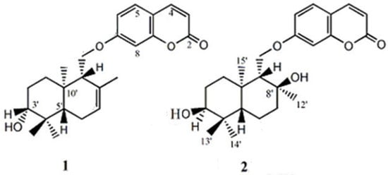 - Kamoldinov, K.; Li, J.; Eshbakova, K.; Sagdullaev, S.; Xu, G.; Zhou, Y.; Li, J.; Aisa, H.A. Sesquiterpene coumarins from Ferula samarkandica Korovin and their bioactivity. Phytochemistry 2021, 187, 112705. [Google Scholar] [CrossRef] [PubMed]