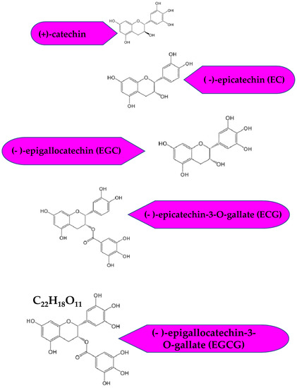 Green tea catechins consist of four major polyphenols, that include: epigallocatechin-3-gallate (EGCG), epicatechin-3-gallate (ECG), epigallocatechin (EGC), and epicatechin (EC) [2]. EGCG is the chieftain among the catechins; it constitutes about 50–80% of the total catechin content [95,96,97]. Catechins are not only soluble in water, but also in ethanol, methanol, and acetone. Pure catechins from tea are obtained following a separation protocol. Separation and isolation procedures for tea catechins involve extraction processes such as (i) treatment of the starting material, (ii) the extraction of tea constituents from tea leaves into infusions, (iii) the concentration of the extracted constituents, (iv) the separation and isolation of catechins from other impure components; and (v) drying of the catechins to obtain an extract powder for industrial use [98].