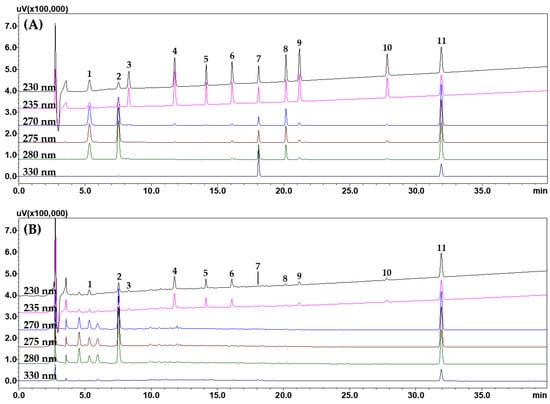 3.3. Optimization of HPLC Simultaneous Analysis Conditions