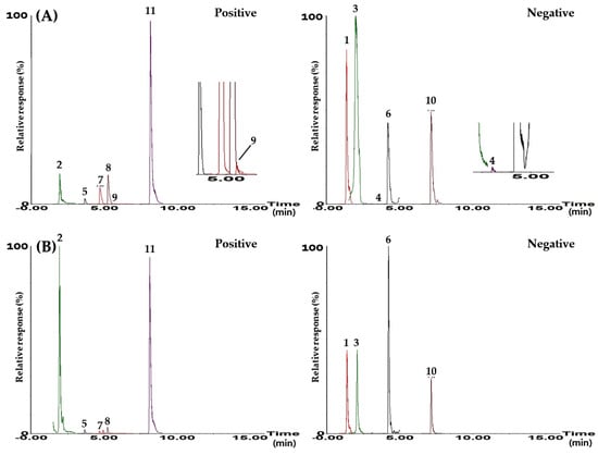 3.7. Simultaneous Determination of Compounds 1–11 in GGSGH Samples Using UPLC–MS/MS
