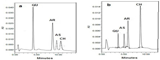 The stabilities of QU, AS, AR, and CH were tested in pure solutions by only leaving their standard solutions in volumetric flasks, which are tightly capped, on both a laboratory bench at room temperature at 25 °C and in the refrigerator at 4 °C. The stock solutions of QU, AS, AR, and CH showed no changes in the peak area values when kept at room temperature for 18 h and for 7 days in the refrigerator at 4 °C.