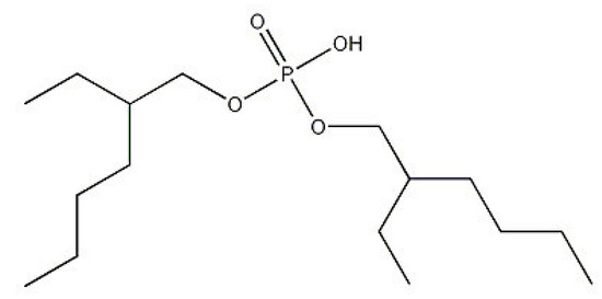 This paper is mainly focused on Tl removal in ammonium rhenate aqueous. We set out to test the hypothesis that the di(2-ethylhexyl) phosphoric acid (P204, Figure 1) plays an important role in extracting the thallium in ammonium rhenate aqueous. A hydrogen bond dimer structure of P204 is used to mask the presence of its polar phosphate group, and is usually also involved in the reaction in the form of dimer when complexed with metal ions. Such extractant was extensively employed in extraction procedures of metals [24,25]. We specifically pay attention to thallium and rhenium behavior, in order to find a new method for purification and impurity removal from ammonium rhenate solution. It was shown that high-tech industries need rhenium metal for turbine blades in aero engines and industrial gas turbine manufacturing [12,13] and the thallium migration and enrichment through solvent extraction is also important for environmental protection [26,27]. Herein, we carried out experiments and an expression analysis of Tl removal by using P204 extraction for the ammonium rhenate refining. As well, these results of the experiments establish a central role of the Tl extraction in the organic phase.