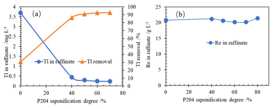 It is shown in Figure 2a that the Tl removal changes slightly when the saponification degree of P204 increases. When the saponification degree of P204 is higher than 50%, the Tl removal is more than 90%. Moreover, when the saponification degree of P204 is higher than 60%, the Tl removal did not change significantly. It is shown in Figure 2b that at the same time as the extraction of thallium, the rhenium concentration in the raffinate is basically unchanged, indicating that P204 extraction will not cause a large amount of rhenium metal loss, which is beneficial for technical industrial applications. In order to keep the efficiency of organic phase stable extraction of thallium, 70% saponification degree of P204 organic was selected for the following experiments.