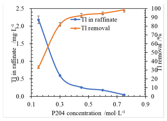 The effects of P204 concentration on Tl extraction and Tl concentration in raffinate were studied and the results of the experiments are shown in Figure 3.