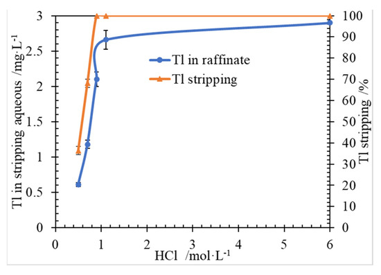 An organic loaded Tl 3.02 mg/L, was used in the feed of stripping experiment. Here, HCl solution was used as the stripping reagent. The effect of HCl concentration on Tl stripping was carried out, and the results were shown in Figure 4.
