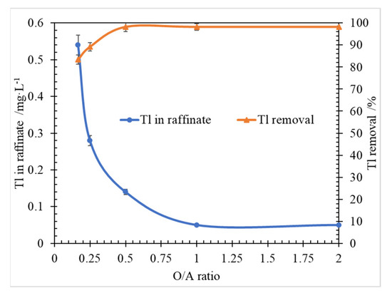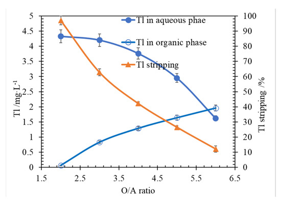 The effects of O/A on metal stripping efficiency were researched. The results are shown in Figure 7. According to the results in Figure 7, when the O/A ratio was larger than 2.0, with the O/A ratio increasing, the Tl stripping was reduced, and the Tl concentration in raffinate was increasing. When the O/A ratio was 2, Tl removal reached 97.0% (Tl 4.30 mg/L in stripping aqueous). When the O/A ratio was 6.0, Tl removal decreased to 12.1% (Tl 1.62 mg/L in stripping aqueous).
