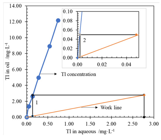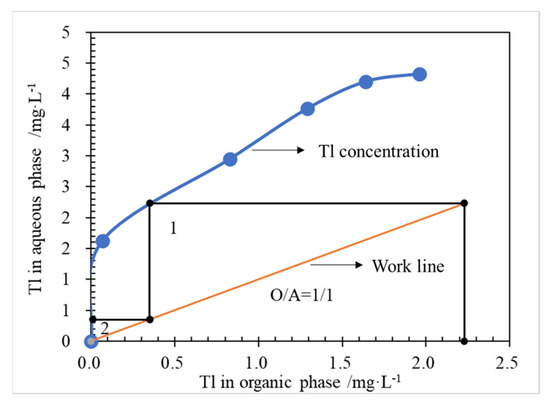 McCabe-Thiele Tl extraction equilibrium isotherms were drawn in Figure 6, according to the experimental results (Figure 5) of O/A comparison conditions. As shown in Figure 6, when O/A works at 1.0, a theoretical extraction of 2 stages is required to obtain the Tl concentration of raffinate less than 18.7 μg/L.