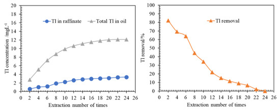 As shown in Figure 9, at the second extraction of a fresh aqueous phase, where the initial molar ratio β is 17,646, Tl removal reached 82.2% (Tl 0.60 mg/L in raffinate), which was reduced with the extraction times increasing. It was investigated that Tl removal was low even at a large initial molar ratio β. This may be due to the Tl concentration difference (ΔCTl) between Tl initial concentration in the organic phase and Tl initial concentration in the aqueous phase. As calculated, the ΔCTl of the second time is −0.50, while the ΔCTl changed to 1.83 at the fourth time, and ΔCTl values of the rest times were 3.98, 5.47, 6.62, 7.36, 7.87, 8.26, 8.56, 8.78, 8.85 and 8.85, respectively.