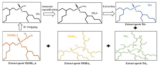 The ion species distribution of Tl and Re in aqueous solution at different pH values drawn with software Medusa (Trial version, KTH Royal Institute of Technology, Stockholm, Sweden) were shown in Figure 10 and Figure 11. The extraction mechanism of Tl by P204 dissolved in kerosene is cation exchange extraction, and can be described in Figure 12. It can be seen in Figure 10 that Tl exists in the form of Tl+, Tl(OH)2+, Tl(OH)2+1, and Tl3+. The presence of Tl+ concentration in the pH range of 0 and 12.0 is basically unchanged, and NH4A(org) [29] can be extracted in the form of TlA(org) to remove thallium (Figure 11). In the pH range of 0–4.7, thallium is mainly present in the form of Tl+, Tl(OH)2+, Tl(OH)2+1 and Tl3+ (Figure 10), NH4A(org) can extracts Tl in form of TlA(org), TlA3(org), Tl(OH)2A (org) and TlOHA2 (org) (Figure 12), Tl+ concentrations is higher than Tl(OH)2+, Tl(OH)2+1 and Tl3+ ion concentrations (Figure 10). it is speculated that TlA (org) is the main extract. It is indicated in Figure 10 that rhenium mainly exists in the form of ReO4− at the pH range from 1.0 to 12.0. Based on the difference in charge properties between Tl+, Tl(OH)2+, Tl(OH)2+1 and ReO4−. P204 as a cationic extractant, may be used to extract Tl+, Tl(OH)2+ and Tl(OH)2+1 separating from ReO4− ion.