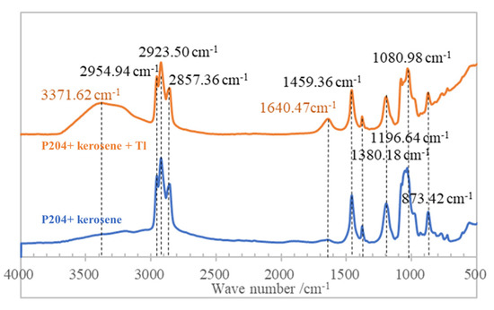 Infrared spectrum analysis was carried out on samples of unloaded organic of P204 + kerosene mixed and Tl loaded organic of P204 + kerosene + Tl mixed. The spectral diagram is shown in Figure 13. The differences between the spectra of these organic samples are absorption peaks at wave number 3371.62 cm−1 and 1640.47 cm−1 in the spectra of Tl loaded organic phase of P204 + kerosene + Tl mixed, which is mainly caused by the substitution of Tl for NH4+ ion in the carbon chain of P204 for -NH stretching vibration and -NH in-plane bending vibration.