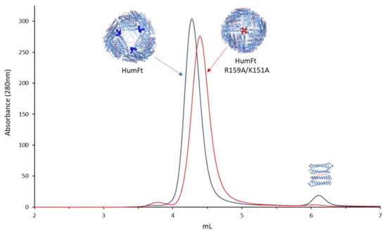 - Calisti, L.; Benni, I.; Cardoso Trabuco, M.; Baiocco, P.; Ruzicka, B.; Boffi, A.; Falvo, E.; Malatesta, F.; Bonamore, A. Probing Bulky Ligand Entry in Engineered Archaeal Ferritins. Biochim. Biophys. Acta BBA-Gen. Subj. 2017, 1861, 450–456. [Google Scholar] [CrossRef] [PubMed]