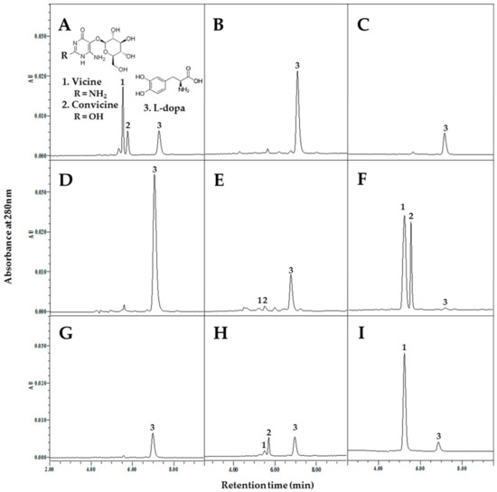 - Goyoaga, C.; Burbano, C.; Cuadrado, C.; Varela, A.; Guillamón, E.; Pedrosa, M.M.; Muzquiz, M. Content and distribution of vicine, convicine and l-DOPA during germination and seedling growth of two Vicia faba L. varieties. Eur. Food Res. Technol. 2008, 227, 1537–1542. [Google Scholar] [CrossRef]