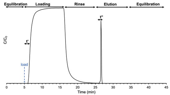 Frontal loading experiments were used to assess the EV adsorption and determine the dynamic binding capacities for the EV populations on the C-CP fiber stationary phase [,,,,,]. The current work builds on previous work to examine the capability of the C-CP fibers to load and recover EVs from complex matrices []. Therefore, to maintain consistency in comparison with earlier efforts, the throughput (T) and yield (Y), calculated as described by Singh and Pinto [], were employed as the figures of merit in the present work. Frontal analysis first allows for the determination of the amount of adsorbed solute (Q′) based on its concentration (mg mL−1), the delivery rate (mL min−1), and the time (t′ in min) to reach the point at which the absorbance value at the column exit reaches one-half of the value of the maximum value following column saturation (C/C0 = 0.5), as depicted in Figure 1. The process throughput () is a measure of the ability to adsorb and recover the solute, as expressed in Equation (1), where the amount recovered (Q′) is determined via the standard addition approach, and the elution time (t″) is added as the time necessary to complete the recovery.
