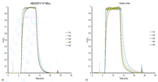 A human embryonic kidney cell line (HEK293T/17 SF), which was modified to a serum-free, suspension-adapted culture environment (to avoid the limitations of using fetal bovine serum) was obtained from the American Type Culture Collection (ATCC, Manassas, VA, USA) [,,]. As previously described [], the HEK293 cells were grown in BalanCD HEK293 cell culture media (Irvine Scientific, Santa Ana, CA, USA) supplemented with L-glutamine (8 mM) and insulin-transferrin-selenium (ITS) (10 mL mL−1) (Corning, Corning, NY, USA). The culture flask was placed in a 37 °C shaking incubator (160 rpm) with 5% CO2. To monitor the concentration and viability of the cell line, a VI-CELL XR Cell Viability Analyzer (Beckman Coulter, Brea, CA, USA) employing the trypan blue dye exclusion method was used. All milieu samples were filtered with a 0.22 mm PES syringe filter prior to use. In terms of the human urine matrix sample, fresh morning urine from a healthy, consenting donor was obtained and filtered with 0.2 mm PES filters before use. No other sample manipulations were performed.