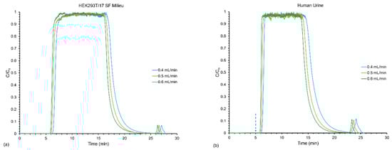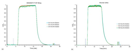 Frontal loading response for the effect of varying the elution flow rate from 0.4–0.6 mL min−1 while maintaining the loading flow rate at 0.5 mL min−1 for (a) HEK293T/17 SF Milieu and (b) human urine samples.