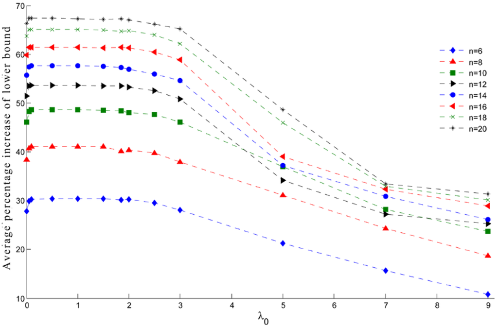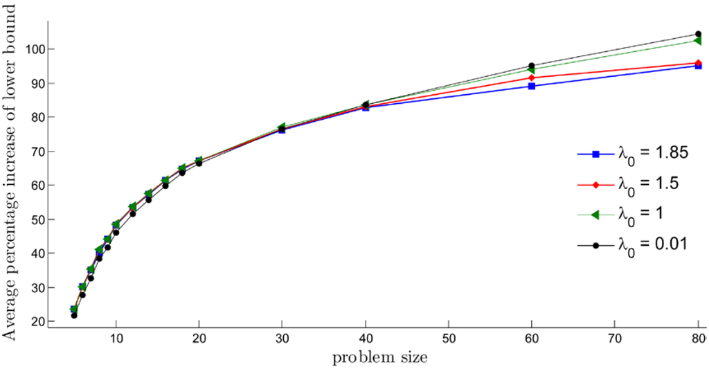 In our implementation, we show lower bounds behavior for the different cases of . Figure 1 depicts the average of the percentage increase of the lower bound when 1.85, 1.5, 1 and 0.01 are employed. After applying the modified subgradient optimization procedure, the lower bounds of all instants were increased from the initial lower bound generated from an admissible transformation. However, the figure still indicates that, if a problem size is smaller, a higher should be employed. On the other hand, for a bigger problem size, a smaller should be used.