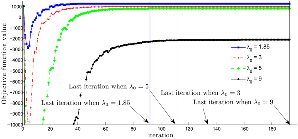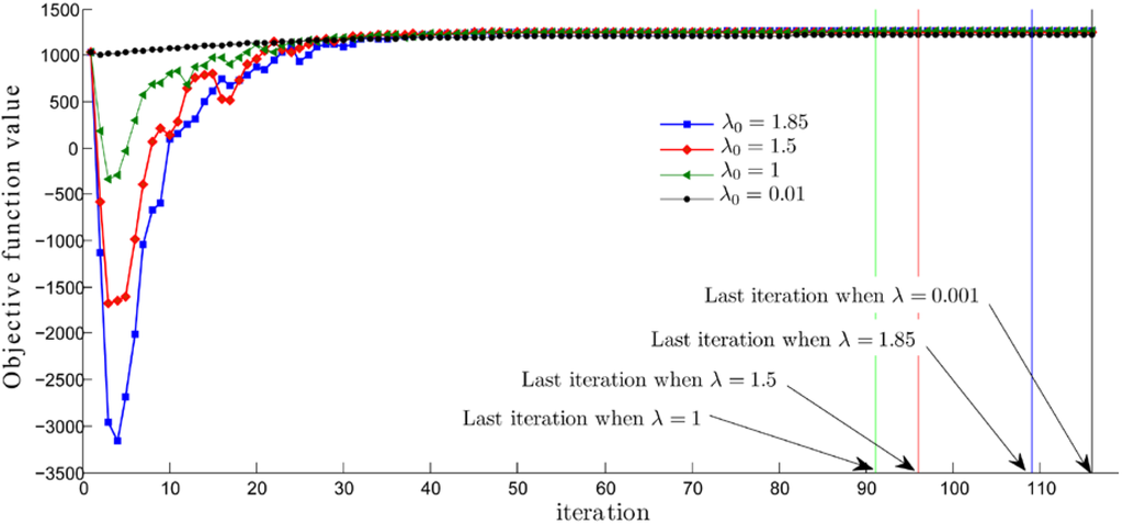 Consider the sequence of the objective function values of the considered instants, an example of which can be seen in Figure 3. The values decrease for some early iterations, then quickly increase for some iterations after hitting the possible minimum value (a sink point in the figure). After some iterations (mostly about 30 iterations), the values faintly increase until the stopping criteria are met. However, the objective function values in some iterations may be lower than some previous iterations, but this does not have an effect on the tendency of the sequence, as is shown in Figure 3.