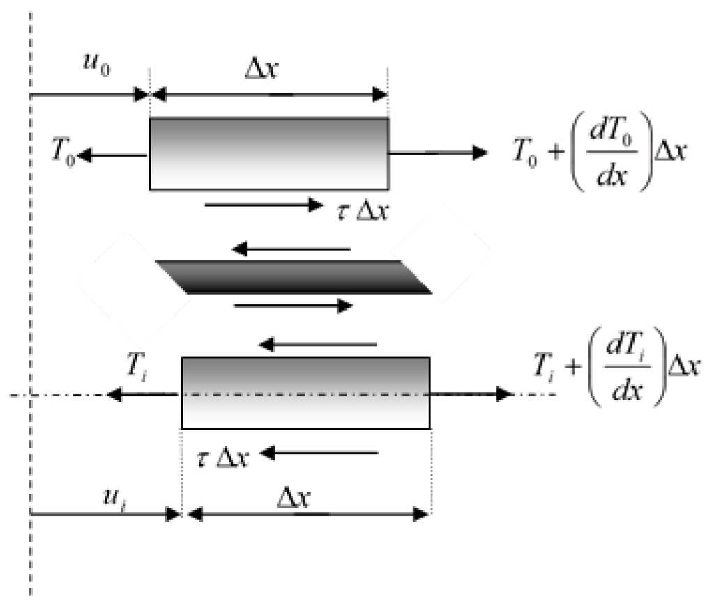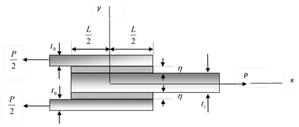 In this investigation an analytical solution was carried out in a double-lap joint with a ductile adhesive. The adherends were chosen as different aluminum plates. The middle adherend (Ti) was subjected to plastic deformation; however, the outer adherends (To) were elastic. In Figure 3, the displacement of the Y axis, which is denoted as uY, is equal to zero in the middle of the adherend. In addition, the displacement of the X axis, which is denoted as uX, is equal to zero in the outer adherend. These displacement values were chosen for satisfying the boundary conditions.