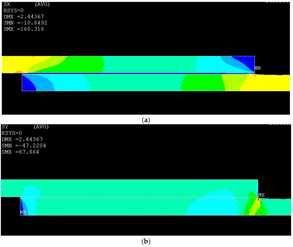 - Sayman, O.; Ozel, A.; Pasinli, A.; Ozen, M. Nonlinear stress analysis in adhesively bonded single-lap joint. J. Adhes. Sci. Technol. 2013, 27, 2304–2314. [Google Scholar] [CrossRef]