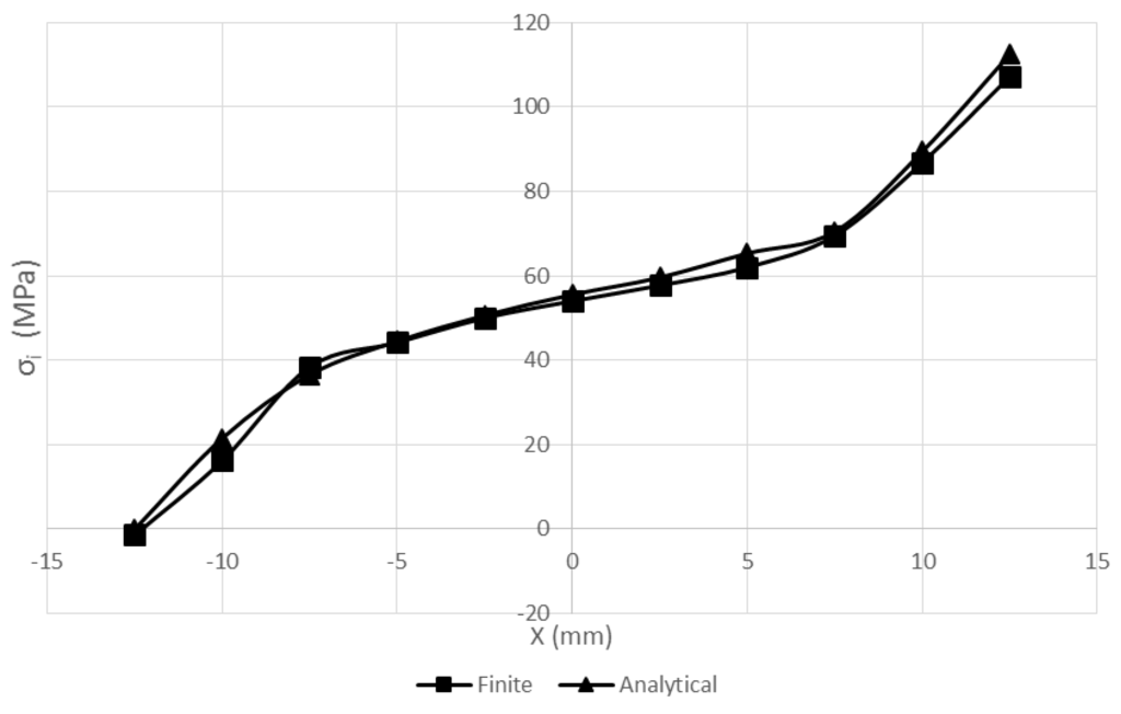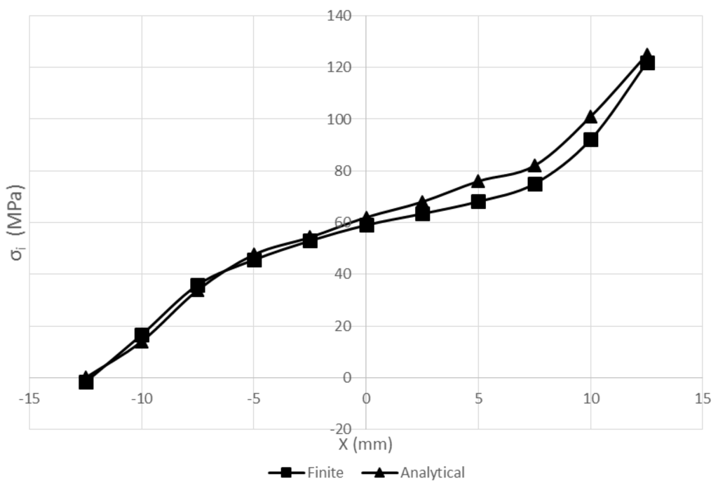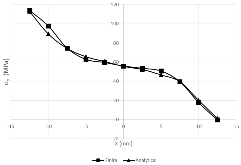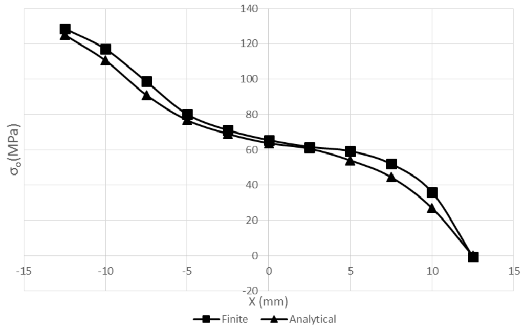The distribution of the stress component at the upper adherend for is shown in Figure 6. As seen, it decreases at points distant from the left free end. It has a value of about 125 MPa at the left free end. It vanishes at the right free end, where .