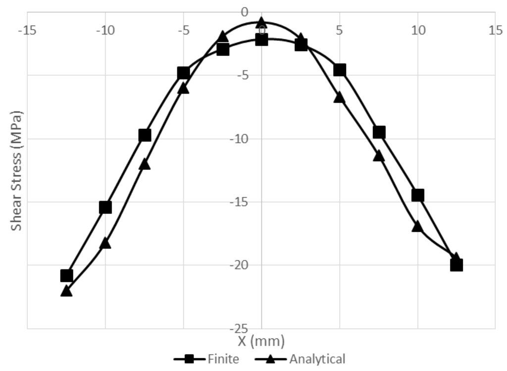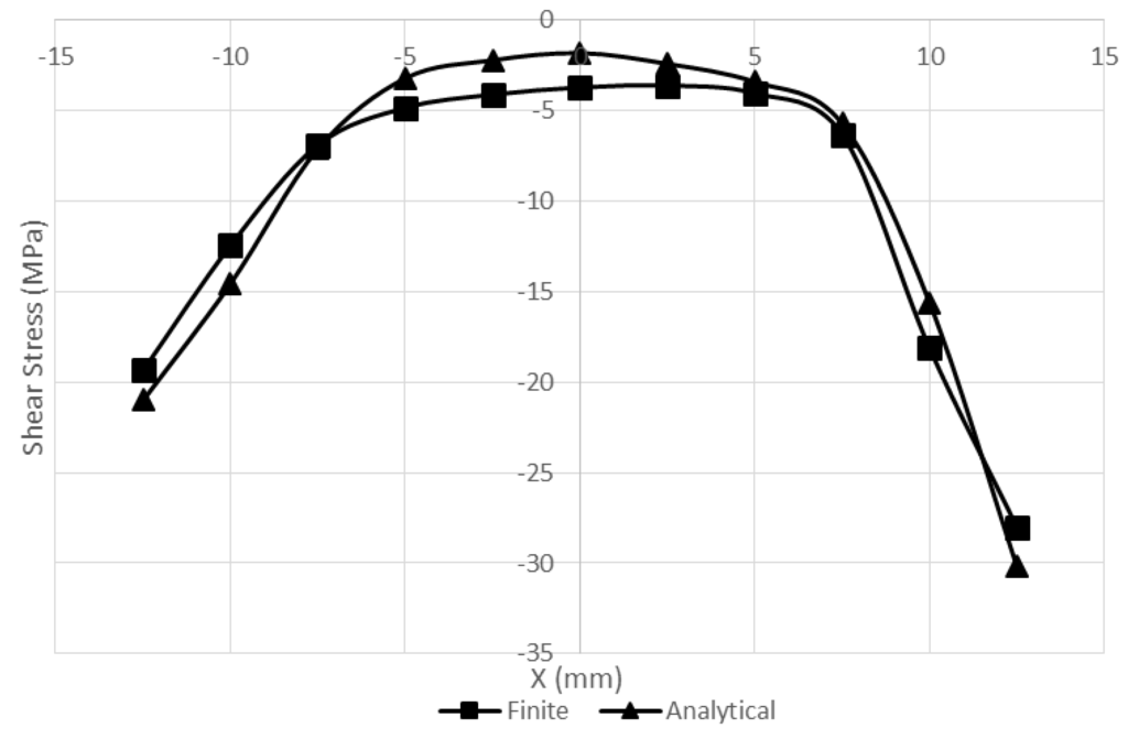 The distribution of the shear stress for through the adhesive is shown in Figure 9. As seen in this figure, close results are obtained for the finite element and analytical methods. It has the largest values at the free ends.