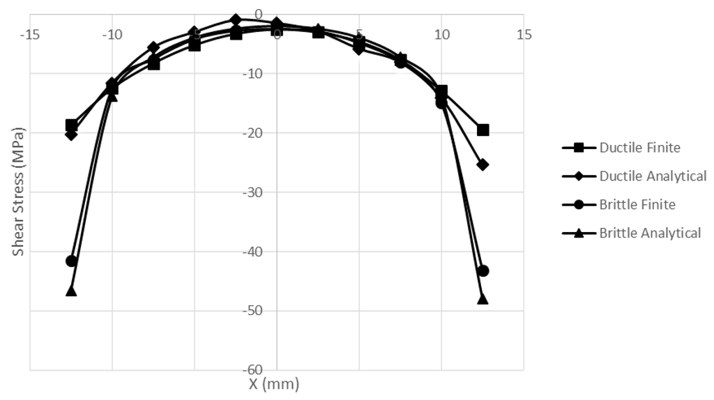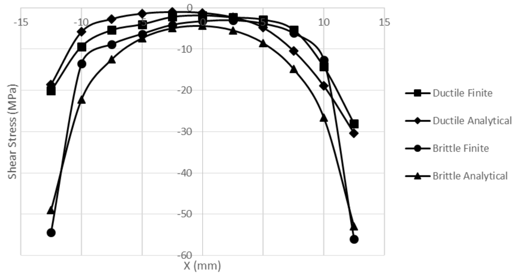 As seen in all of the figures, the analytical solution for the one-dimensional case and the FEM solution for the two-dimensional cases produced close results. In addition, the brittle adhesive Loctite was employed in the joint. The brittle and ductile adhesives were compared. The mechanical properties of the brittle adhesive are close to those of the ductile adhesive given in Table 3.
