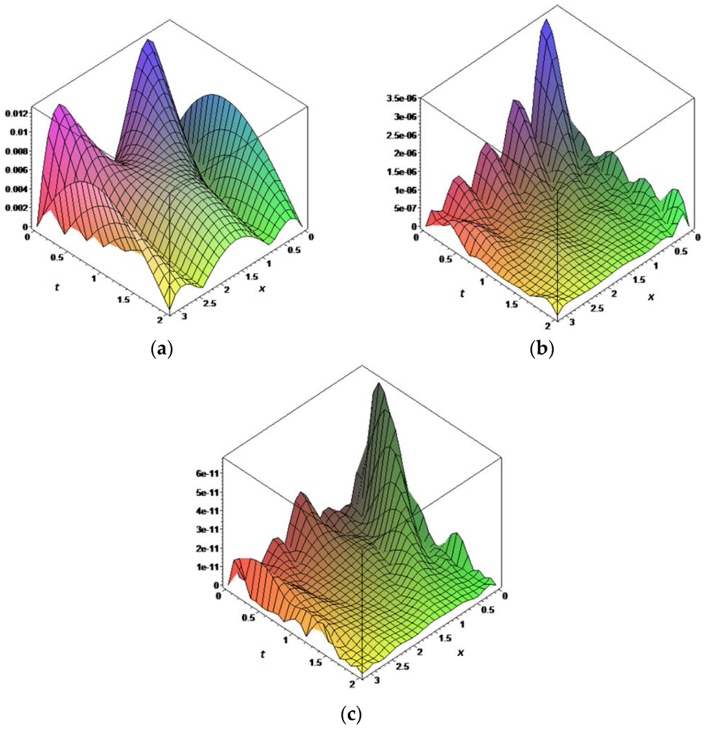 Graphs of the absolute error functions of Exp. 2 for and . (a) The absolute error function for ; (b) The absolute error function for ; (c) The absolute error function for